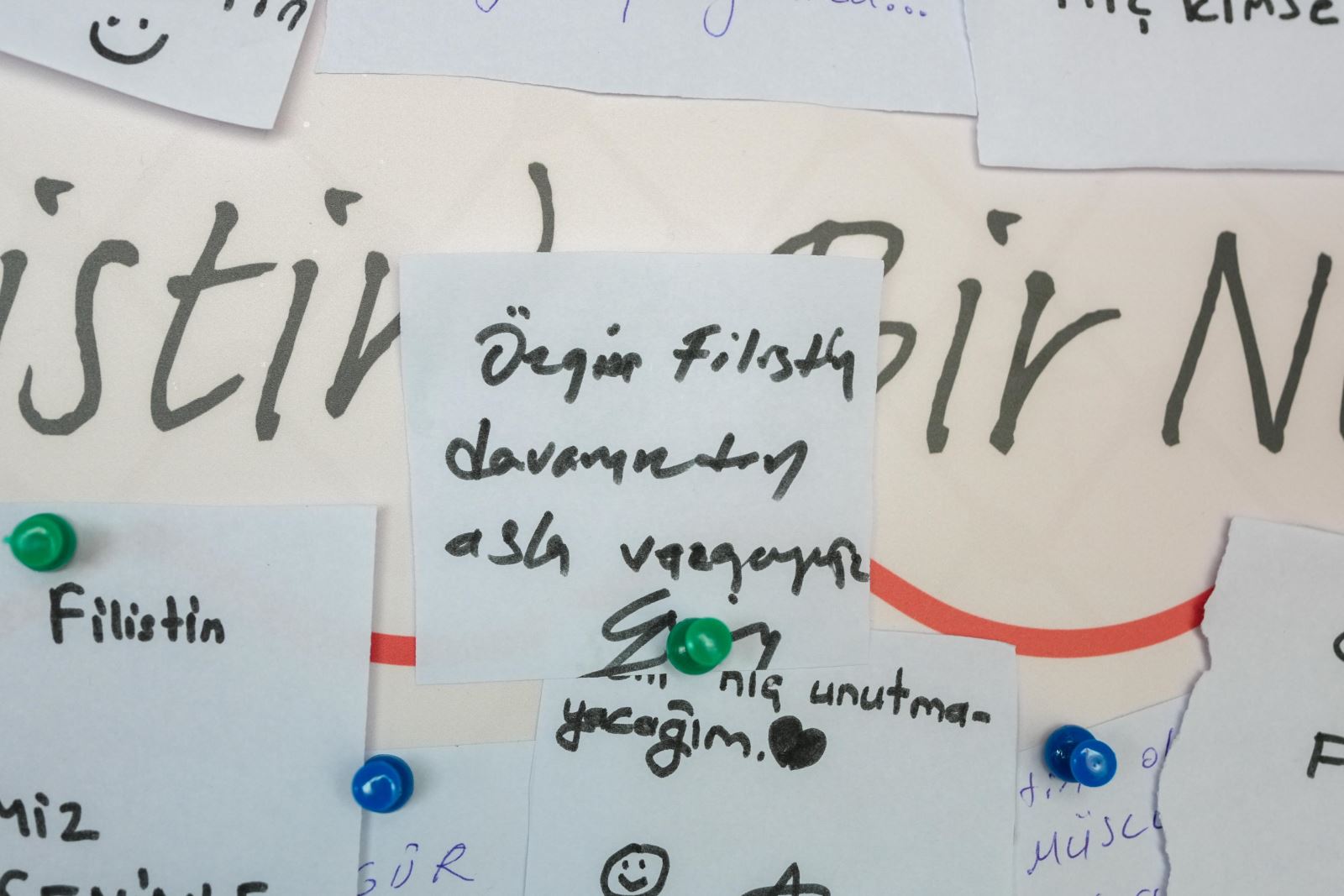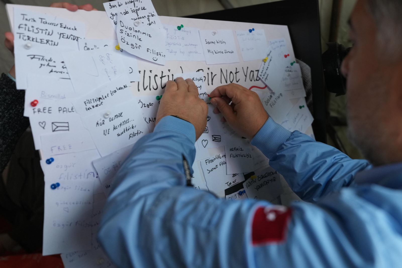 Ayrıca Halkbank, Türk Telekom, TRT ve KADEM stantlarını ziyaret eden Şahin, KADEM’in not panosuna “Özgür Filistin davamızdan asla vazgeçmeyeceğiz.” ifadelerini yazdı.